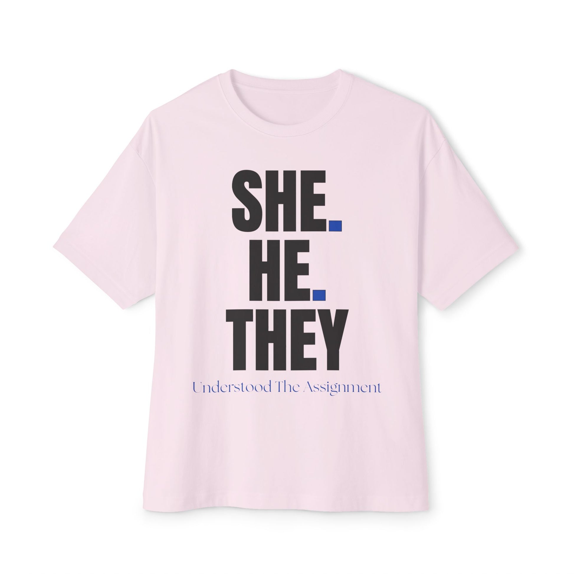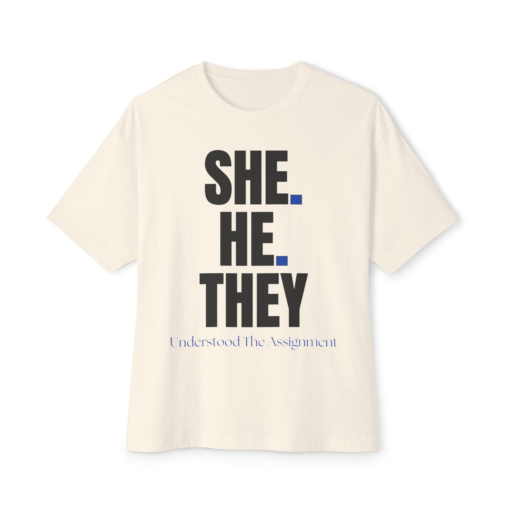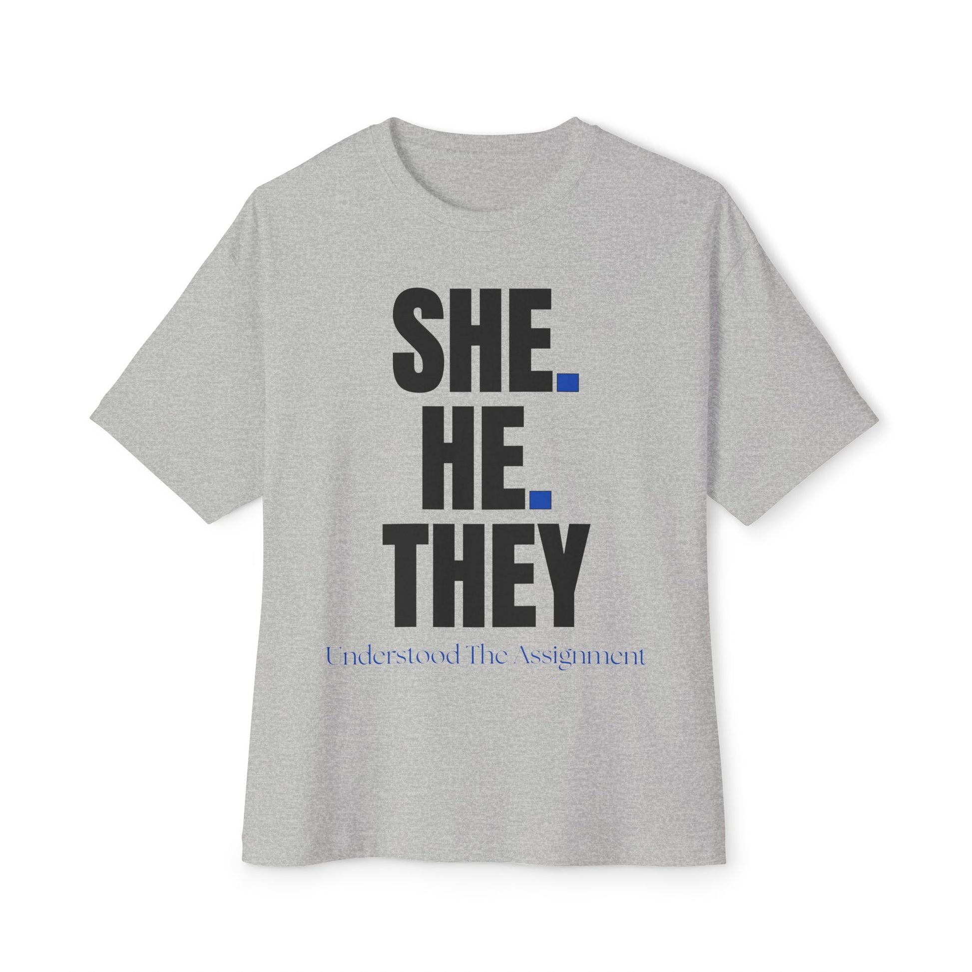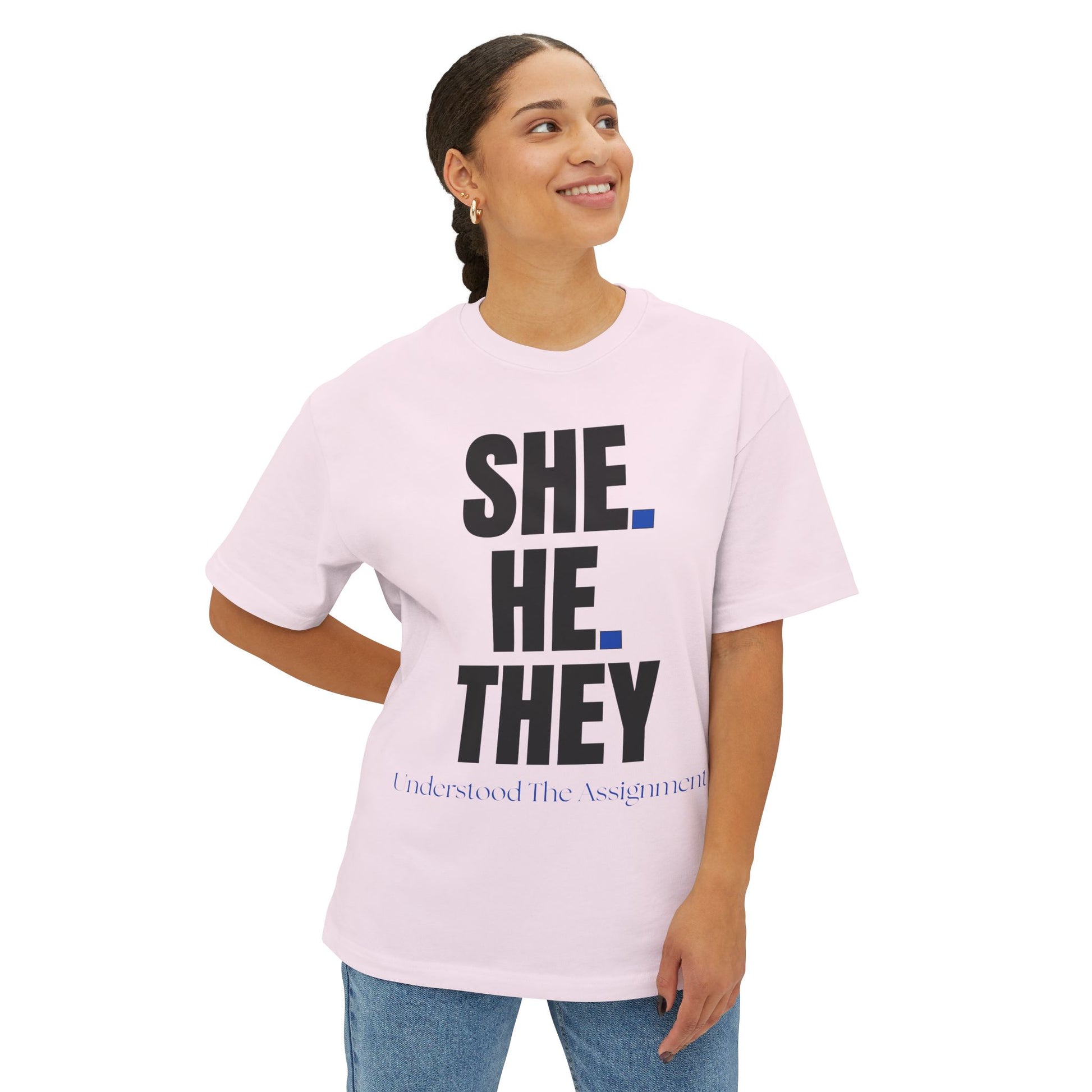 SHE. HE. THEY - Gender Identity Awareness Boxy Tee, Unisex Oversized Shirt, LGBTQ+ Pride Tee, Inclusive Fashion, Everyday Casual Wear
